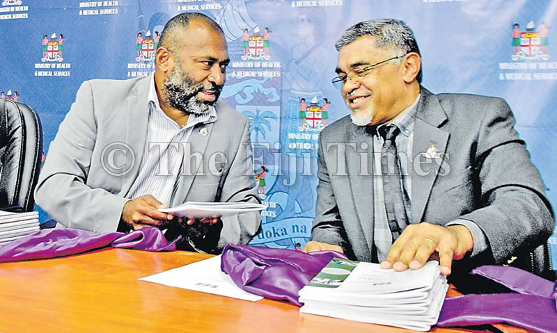 Health Minister Dr Ifereimi Waqainabete (left) and Ministry of Health and Medical Services permanent secretary Dr James Fong during the launch of the Guidelines for Climate Resilient and Environmentally Sustainable Health Care Facilities in Suva on Wednesday. Picture: SOPHIE RALULU