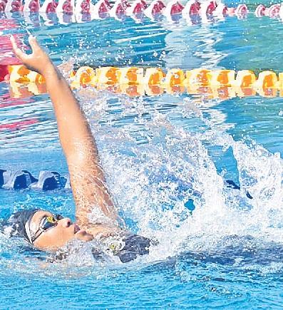 Salanieta Kunatuba of the Dolphins Swimming Club competes in the 100m backstroke event at the Damodar City Acquatic Centre in Suva yesterday. Picture: ATU RASEA